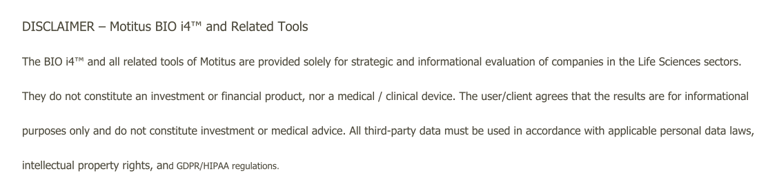 BIO i4™ is Motitus’ proprietary strategic intelligence framework for understanding the positioning and potential of companies in biotechnology, pharmaceuticals and healthcare.